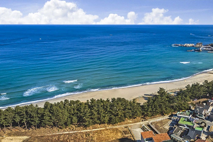 자그마한 해변이 반달처럼 휘어져 아담하며, 해변 뒤에는 소나무 숲이 우거져 있고 양쪽 끝은 기암절벽으로 어우러진 아름다운 곳이다. 해수욕장 가운데로 용화천이 흘러 담수욕을 할 수 있고, 파도가 높지 않아 밤낚시도 즐길 수 있다. 매년 7월 10일부터 8월 20일까지 해수욕장으로 운영된다. 출처 : 대한민국구석구석(korean.visitkorea.or.kr) → 펜션에서 차량으로 약 2분