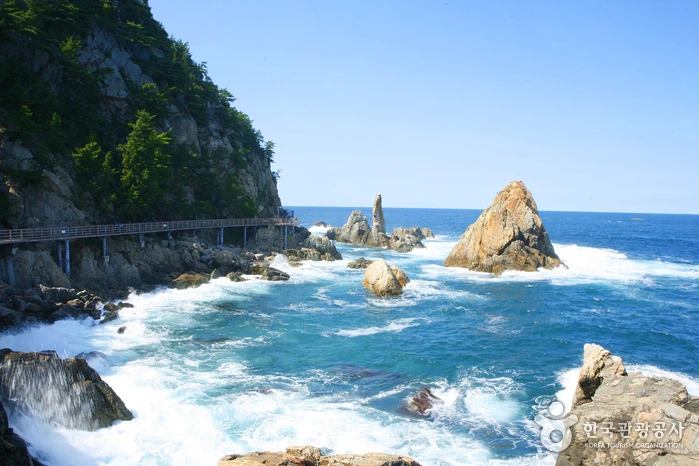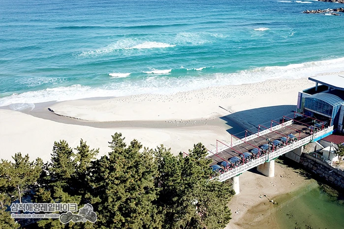 기존 레일바이크와 다르다. 아름다운 동해바다를 끼고 달리는 해양레일바이크다. 곰솔이 늘어선 숲길과 기암괴석은 물론, 루미나리에 동굴 구간도 특별한 볼거리다. 시원한 바닷바람 맞으며 즐기는 흥미진진한 삼척해양레일바이크는 2014년 ‘한국관광의 별’ 문화관광자원 부문에 선정됐다. 출처 : 삼척해양레일바이크(http://oceanrailbike.com) → 펜션에서 차량으로 약 2분