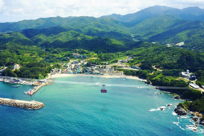 삼척시 근덕면 용화리에서부터 장호리까지 운행하는 삼척해상케이블카는 용모양의 역사 2개가 서로 마주보고 있는 형태입니다. 길이 874m, 고저차(역사간 높이차이) 21m의 중간 철탑이 없는 구간을 Sunshine호와 Sunrise호가 바다 위를 가로지르며 운행됩니다. 삼척해상케이블카를 타고 천혜의 자연절경과 청정해변을 감상하실 수 있습니다. 출처 : 대한민국구석구석(korean.visitkorea.or.kr) → 펜션에서 차량으로 약 3분